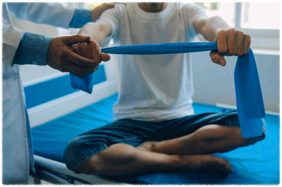 - 회전근개 고무밴드 운동: 팔꿈치 90도 유지 → 바깥 방향 벌리기