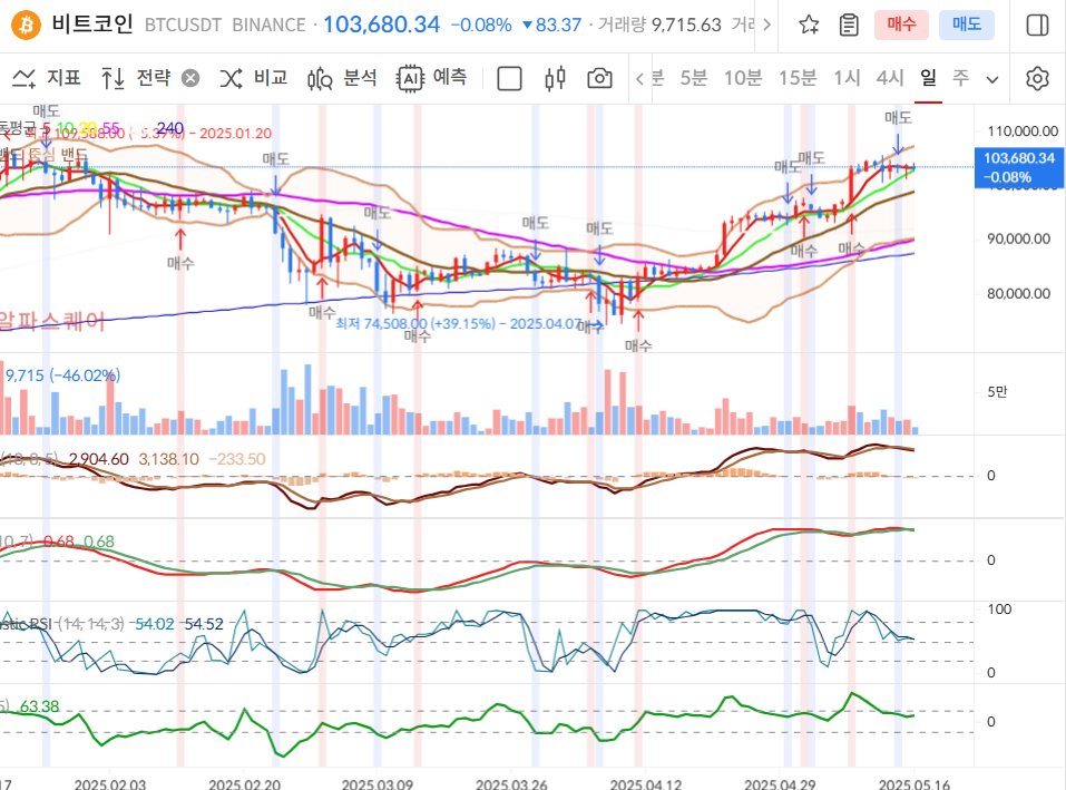 비트코인은 올해 3월부터 급격한 상승세를 보이며 $90,000선을 돌파하고, 5월 초에는 $110,000 부근까지 도달했습니다. 하지만 최근 몇 거래일 동안 음봉 캔들이 연속적으로 출현했고, 특히 5월 14일 이후 거래량이 감소한 채 조정세가 지속되고 있다는 점은 주의가 필요합니다.