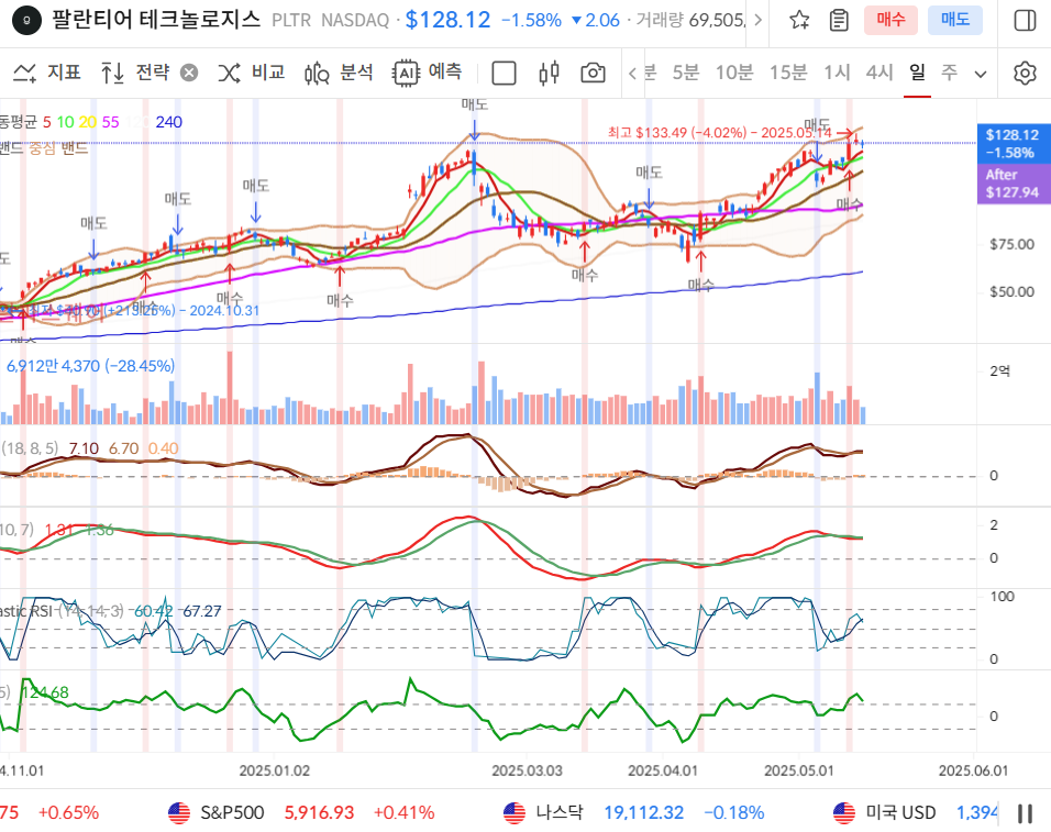 📊 팔란티어 일봉 차트 분석 (2025.05.16 기준, $128.12)